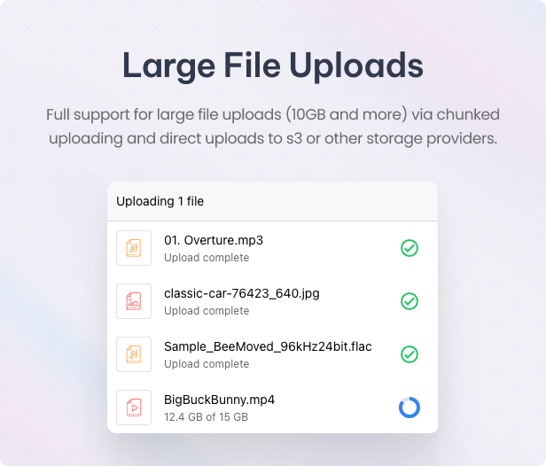 Support for chunked file uploads, allowing large files to be uploaded in smaller, manageable pieces, ensuring reliability and bypassing maximum file size restrictions on cheaper hosting providers.>