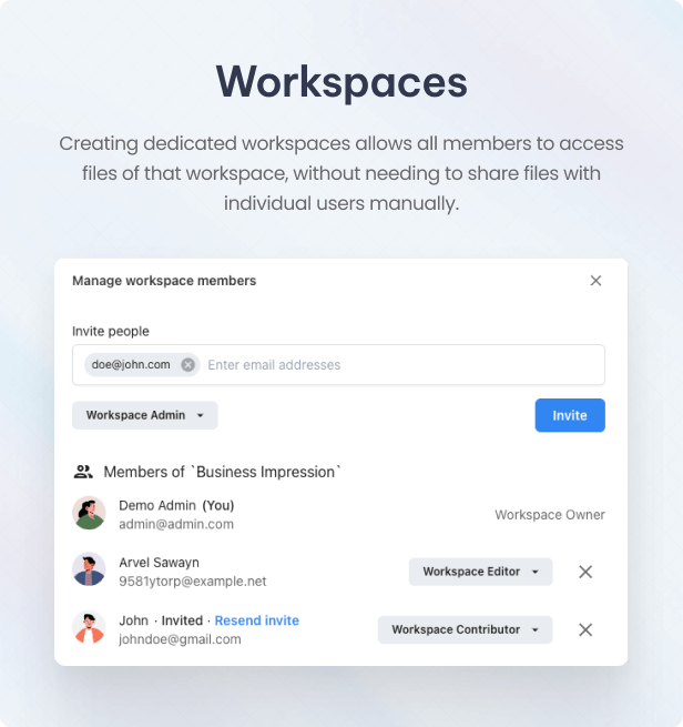 Creating dedicated workspaces allows all members to access files of that workspace, without needing to share files with individual users manually.