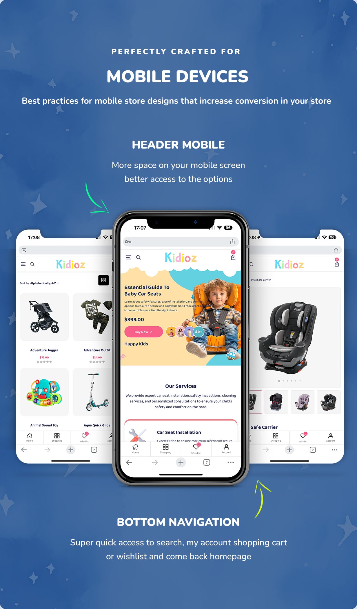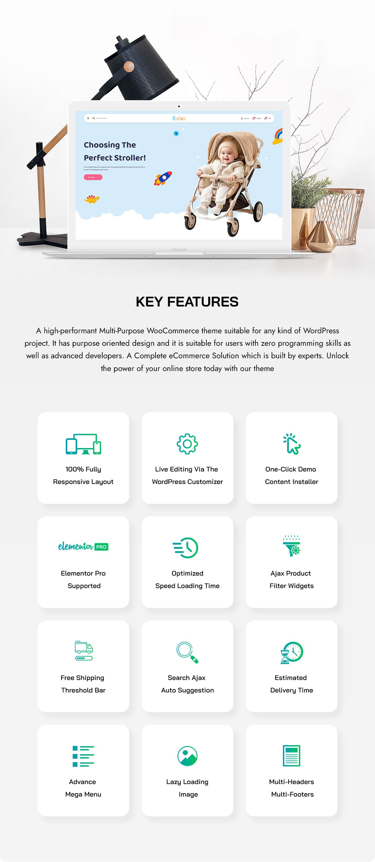 Baby product stores featuring essentials like strollers, bottles, and car seatsKids’ boutiques offering clothing, toys, or accessoriesBrands launching a single flagship product with high visual impactMaternity or parenting shops looking for a soft, family-friendly aestheticStore owners who want the power of WooCommerce combined with Elementor’s easy customizationIf you’re building a brand that values clean design, flexibility, and performance, Kidioz is the perfect theme to bring your storefront to life.