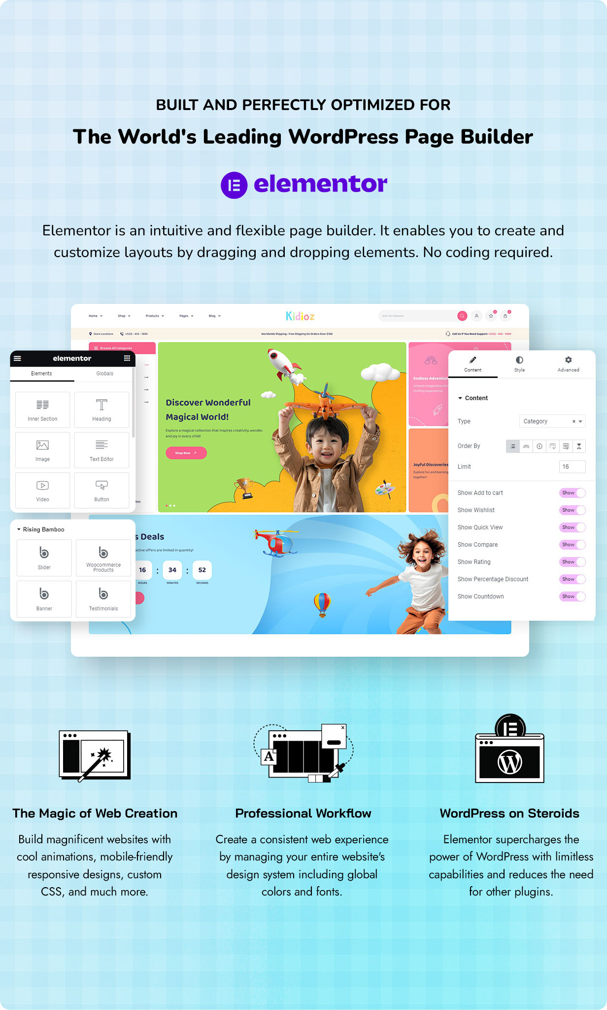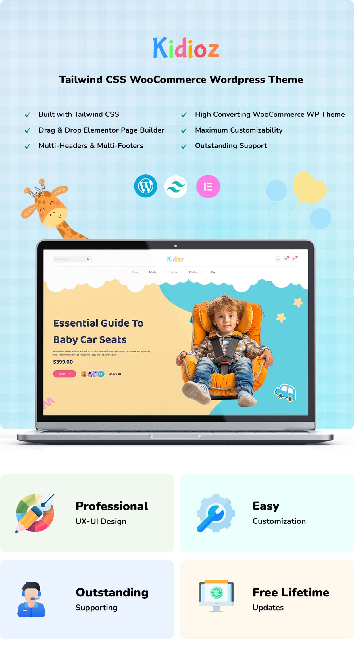 Powered by Elementor Page Builder and styled with Tailwind CSS, customization is effortless, allowing you to fine-tune every section to match your brand. Whether you’re a first-time seller or a seasoned store owner, Kidioz ensures your website looks stunning, performs fast, and delivers a smooth user experience on all devices.