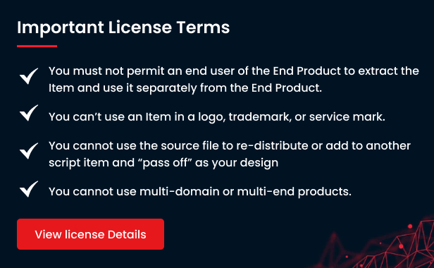 Regular license: Use, by you or one client, in a single end product which end users are not charged for (access is free and there will be no monthly subscription fees). The total price includes the item price and a buyer fee. The Regular License grants you, the purchaser, an ongoing, non-exclusive, worldwide license to make use of the digital work (Item) you have selected. You can’t Sell the End Product, except to one client. (If you or your client want to Sell the End Product, you will need the Extended License.) For more details: https://themeforest.net/licenses/terms/regular Extended license: Use, by you or one client, in a single end product which end users can be charged for. The total price includes the item price and a buyer fee (there is no free access eg: or monthly subscription fees). You are licensed to use the Item to create one single End Product for yourself or for one client (a “single application”), and the End Product may be Sold. This license is a “single application” license and not a “multi-use” license, which means that you can’t use the Item to create more than one unique End Product. For more details: https://themeforest.net/licenses/terms/extended